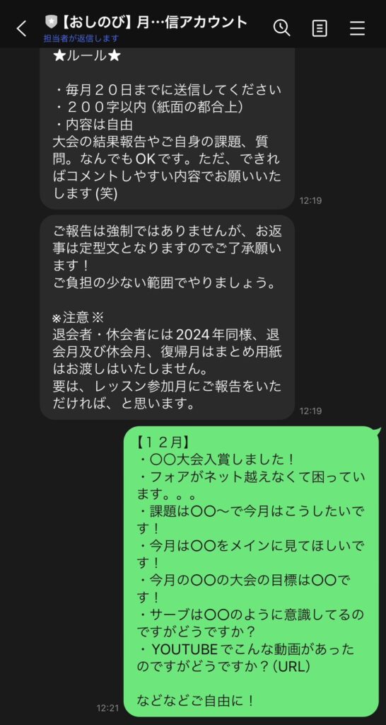 繰り返しにはなりますが、ご報告は強制ではありませんが、お返事は定型文となりますのでご了承願います!ご負担の少ない範囲でやりましょう。